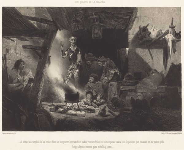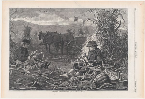 Curator: Winslow Homer's print, "Camping Out in Adirondacks," originally published in Harper's Weekly in 1874, depicts a serene scene of leisure. It resides here with us at the Metropolitan Museum of Art. Editor: It strikes me as remarkably still. The monochrome rendering softens the potential ruggedness of the landscape, focusing my attention instead on the subjects and the geometric form of their shelter. Curator: Observe Homer’s strategic use of line and contrast. The intricate details in the clothing and the subtle gradations in the mountains exemplify realism. Note especially the dynamic use of engraving to create visual depth, isn't it marvelous? Editor: And that focus allows us to really interrogate the narrative. Look at the figures: presumably white men in a space marked by a violent history of indigenous removal. That leisurely camping belies the colonial undertones inherent in representations of the American wilderness during this period. The seemingly innocent act of "camping" can then be viewed through the lens of historical dispossession. Curator: I am inclined to disagree. To see it solely in this way, you undermine Homer’s compositional decisions. The overlapping shapes and lines of the canoes and mountain ranges create dynamic symmetry. Notice, also, the meticulous crosshatching to illustrate varying textures - bark, cloth, skin... To frame that as strictly colonialist overlooks the sheer formal skill present. Editor: But form isn't devoid of content. The technical skill that you rightly acknowledge works precisely to normalize such colonialist ideals through aesthetically pleasing imagery. Isn't the seemingly benign portrayal of nature masking its own historical violences? Curator: Perhaps... I'll concede it reveals, as much as conceals. Editor: Indeed. Seeing how technique is never neutral reminds us of how layered meaning can be, so far removed from Homer's time, still relevant in ours. Curator: A potent reminder that visual engagement can foster profound cultural reckonings.