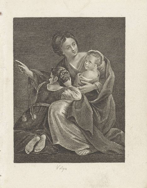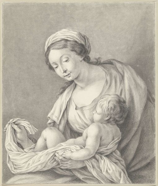 Editor: This is Pierre Daret's *Madonna and Child*, found at the Harvard Art Museums. It's an engraving, and I'm struck by the detail in the fabrics. What can you tell me about the making of this print? Curator: Consider the labor involved in creating this image. The printmaking process, the tools used—the burin meticulously incising the plate. Notice the materiality of the paper, likely handmade. It reflects a specific mode of production and a market for religious imagery. Editor: So, it's less about the divine and more about the process of creating it? Curator: It's about understanding how the image was constructed and consumed. The labor, materials, and distribution networks are all integral to understanding its meaning. What do you take away from considering it that way? Editor: That really does change how I see it. It's about how it was made, and who had access to it. Thanks!