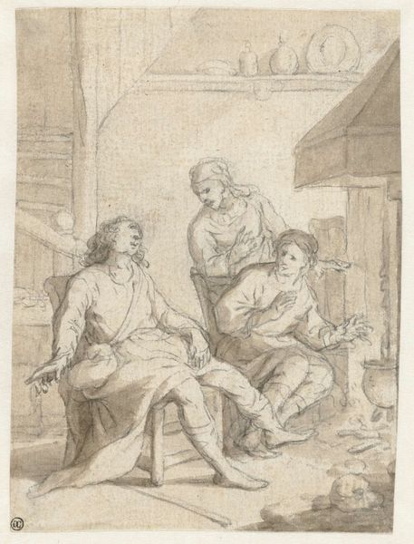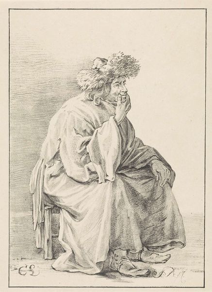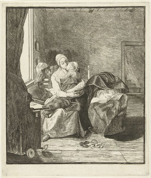 Pieter de Mare created this print, 'Vrouw in katzwijm', sometime before his death in 1796, likely in Amsterdam. It depicts a woman who has fainted in her bed, while a man, possibly a doctor, looks on with concern. The artwork reflects the social norms of the late 18th century, a time when female health was often misunderstood. Fainting was sometimes pathologized as a sign of female hysteria, reflecting gendered expectations and assumptions about women's bodies and emotional states. Here, the woman is passive, confined to her bed, while the man is active and concerned, in a caring role. What does it mean for the woman to be utterly vulnerable, to be stripped, in this moment, of all that might constitute a sense of self? How might we understand this image as a commentary on the power dynamics between men and women of the time? Ultimately, this work presents a tableau of distress, one that invites us to reflect on the historical and cultural contexts that shaped the experiences and representations of gender.