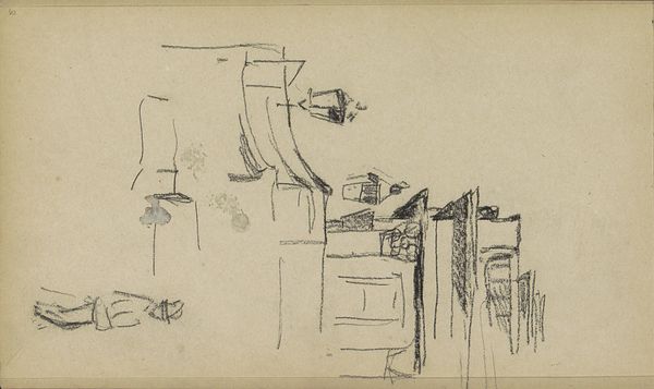 Curator: Welcome. Today, we're looking at "Pui van een winkel op de Nieuwendijk in Amsterdam," a sketch created by George Hendrik Breitner between 1892 and 1900. It is a pencil drawing showcasing a shopfront on the Nieuwendijk. Editor: Oh, instantly I feel that urban buzz—it's like catching a glimpse of Amsterdam life through a rain-streaked window. Raw, immediate. Did he sketch this on the spot? Curator: Very likely. Breitner was known for capturing the energy of city life, a part of a wider movement that emphasized realism. Sketchbooks like these acted as portable studios where urbanity was rendered visible. The use of a drawing highlights an informal setting removed from officialdom, as he explored urbanity in its least mediatized version. Editor: You know, the composition, or lack of rigid composition rather, is what grabs me. It feels like he's not trying to sell me a pretty picture, but showing me the sheer messy vitality of the place. Curator: Exactly. Breitner’s connection with the streets resonates with how social changes were shaping art, emphasizing modern experience and everyday scenes. Breitner himself stated wanting to get the feeling of "something that I see and that strikes me" in his art. Editor: And there's a sense of temporality, you know? A here-and-now quality, as if he jotted this down in a spare moment between rain showers and trams. Is that what appealed to people? Curator: In a way, yes. He provided candid scenes in which modern social relations of class, gender, and commerce are rendered apparent and relatable through their immediacy and informal representation. Editor: It's just... alive. Unlike some posed portrait or landscape. It reflects the democratization of art, and, to me at least, it echoes that feeling of living in a capital. But there is a part of it that feels… unfinished. Like a fragment of something bigger? Curator: That unfinished aspect makes us consider how art and life were seen as entangled, showing how fleeting encounters shape identity in these dynamic cities. Editor: True. It’s as if you could almost smell the damp pavement. Well, I'm utterly transported. Thanks for the insightful contextualisation. Curator: And thanks for adding to the feel! It enriches our understanding, blending historical depth with subjective connection to this snapshot of urban history.