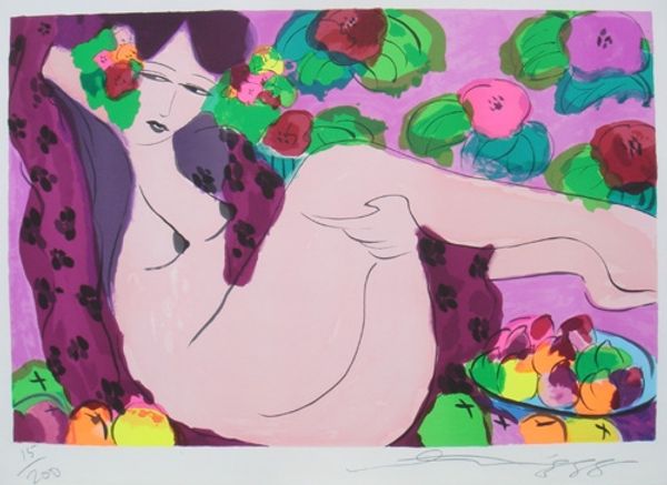 Walasse Ting made this screenprint, "Women with Flowers," in 1988. The color palette is like a poppy field after a big rainstorm, all saturated and intense; it’s a real testament to how colors can sing when they’re put together with guts. Ting's got this way of letting the colors bleed into each other, not really caring if they stay in the lines. It's like he's saying, "Hey, let's see what happens if we just let it all flow." Look at the way the magenta sort of melts into the nude of the reclining figure’s body. It’s almost like a raw nerve ending, radiating sensuality and ease all at once. It reminds me a little of Matisse, who also knew how to make colors vibrate with life. But Ting brings his own joyful, slightly chaotic energy to the mix. It's all about the pleasure of looking, the joy of making, and the sheer, unadulterated fun of being alive.