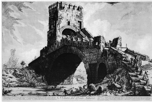 Giovanni Battista Piranesi created this etching, titled "Vedute di Roma", or "Views of Rome", as part of a series of prints that captured the grandeur and decay of ancient Roman structures. Piranesi lived in Rome during a time when the city was seen as a cultural center, attracting artists, intellectuals, and tourists, yet the city also bore the marks of its long history of decline and transformation. Piranesi's work reflects a complex relationship to the past. His prints present Rome as both a majestic testament to human achievement and a poignant reminder of the transience of power. The focus is on the scale and permanence of these ruins, while at the same time emphasizing their fragility through his rendering of crumbling facades. In his own words Piranesi said, "My ideas require that I produce long shadows to increase the effect of their sublimity". The presence of local inhabitants, dwarfed by the structures around them, further emphasizes the passage of time, and the contrast between past and present. Through his dramatic compositions and intricate detail, Piranesi invites us to contemplate the layers of history embedded in the Roman landscape and our place within it.