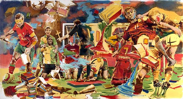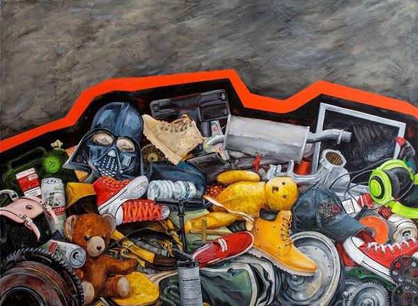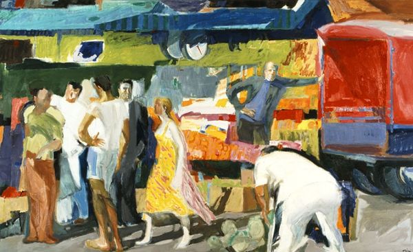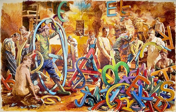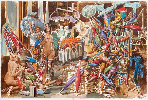Curator: Arsen Savadov created this vibrant and complex piece, "Night Watch," in 2014. It's an oil on canvas. What strikes you when you first look at it? Editor: Absolute chaos! It's like a fever dream painted on a grand scale. There are figures everywhere, fragments of buildings, records… a bizarre yet compelling assemblage. Curator: The chaotic composition is intentional, echoing a sort of cultural frenzy, perhaps. I see the distinct architectural domes – certainly referential of iconic buildings – interwoven with the almost classical rendering of the figures. To me, this presents questions about authority, even the construction of knowledge. Editor: I’m especially drawn to the female figures, rendered with a striking, almost detached sensuality, amidst all these symbols of power and, well, ephemera. It reads like an exploration of the female form in a male-dominated society, presented amidst its artifice. What role do you think mythology plays here, given the title? Curator: The title, "Night Watch," conjures images of vigilance, yet what are they watching? Perhaps the decay of values, the societal obsession with recording, with ‘vinyls,’ so to speak, instead of true presence? There's a mythological undertone, not in direct depiction but more in the epic scale of human drama being portrayed. This certainly aligns with your consideration of gender roles and how society portrays bodies through cultural construction. Editor: And I see those sets of eyes in the background watching it all. To me, that element gives a distinct commentary on constant surveillance and societal gaze – almost a kind of Brechtian alienation, that everything is being witnessed and performed. Curator: An excellent point. Savadov certainly engages in that larger socio-political commentary. As the cultural and political structures shifted, what was art's place, role, and voice amidst a society facing crisis? Savadov asks that through this artwork. Editor: Seeing these layers, it feels so timely for our age of image overload and performative activism. Curator: I agree, it transcends being just an artistic statement and grows into something more socio-politically critical, creating a dialogue with our times. Editor: It leaves you pondering on a critical and conscious note, and as a viewer, how could you not keep investigating?