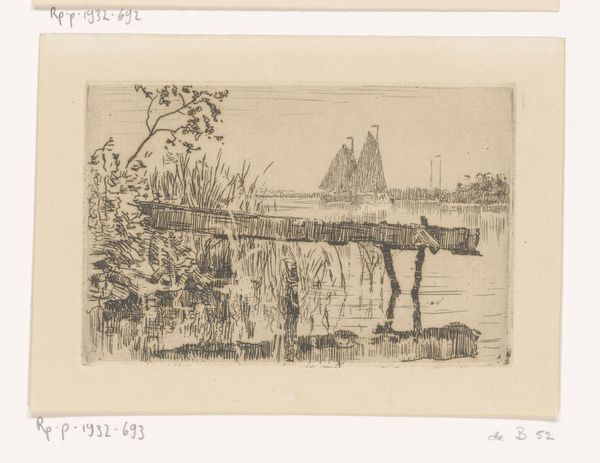 Maurits van der Valk created this etching, "Ondergelopen weilanden bij Warmond", using the fairly common technique of etching, an intaglio printmaking method. The scene shows a flooded landscape, with posts emerging from the water in the foreground. Etching involves coating a metal plate with a waxy, acid-resistant substance. The artist then scratches an image into this coating, exposing the metal. When the plate is immersed in acid, the exposed lines are eaten away, creating grooves. These grooves hold ink, which is then transferred to paper under high pressure. The linear quality of the image, with its fine, precise lines, is characteristic of the etching process. The artist would have had full control over the depth and width of the lines by varying the strength of the acid and the time of submersion. This allowed for subtle variations in tone and texture, essential for creating a sense of depth and atmosphere. The final print is a testament to the artist’s skill in manipulating materials and processes. Understanding this helps us move beyond mere aesthetic appreciation, and towards a deeper understanding of the image itself.