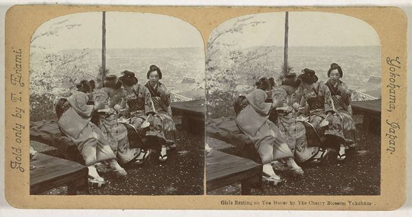 Curator: This gelatin-silver print, taken between 1900 and 1935 by Neville Keasberry, is titled "Groep contractarbeiders tijdens hun pauze," which translates to "Group of Contract Laborers During Their Break." What strikes you first? Editor: An unsettling stillness, almost a posed formality, during what’s meant to be their down time. And it is a genre painting, not merely a candid snapshot. I think someone definitely had to organize the laborers here. Curator: Indeed. The image itself, a stereo photograph, would have been consumed as exotic documentation but think of the exploitation inherent in that viewing process. How different the laborers lived experience on their break was versus how these Western views wanted to depict it. Editor: You see that also, I almost feel their weariness radiating through this old silver print. It’s somber and muted but it's not necessarily sadness, it feels more like just quiet endurance. You are looking straight into an endless life of working like that, it is like looking in a dark, opaque, cold surface. Curator: Let’s not romanticize hardship, though. These "contract laborers" were bound by agreements that benefited plantation owners, fostering global flows of capital at immense human cost. The print as artifact reflects that asymmetry. Editor: It is a harsh observation but still visually compelling, this tableau of resilience. The baskets and tools, these workers clothes, all elements involved are simple, there are no adornments, nothing else around just dirt. A break for the men is the same as working like always, nothing is changed. What does the break accomplish if is visually the same? Curator: Consider the consumption of these images – destined for stereoscopes in Europe perhaps – distant consumers detached from this grueling reality in Malang, Java. The material existence of the image is the means of separating viewers from those represented within. Editor: Absolutely! I feel that disconnection palpably. The photo lets me peek, but I can’t touch or change the story unfolding within it. Thanks to this chat, the image got a complete different take for me. Curator: Agreed. Analyzing art beyond just aesthetics opens us to power dynamics, class consciousness, and historical production. And that for me is a job well done!