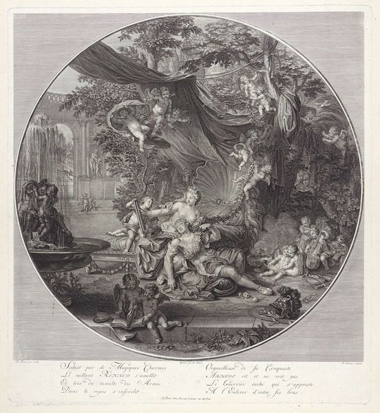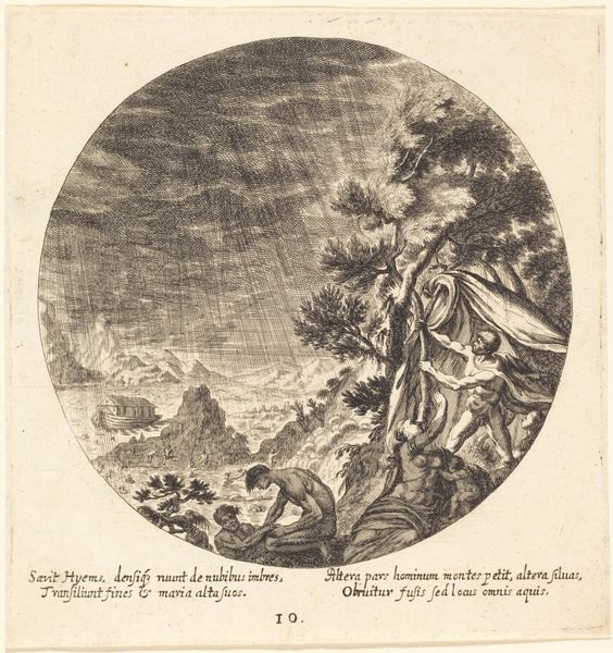 Curator: Welcome. This print is called “Pyramus and Thisbe” and it was created anonymously sometime between 1500 and 1600. It's a striking example of intaglio, likely an engraving, showcasing the tragic tale. The circular format lends it an almost medal-like quality. Editor: My first thought is: what a grim scene rendered with such fine detail. The linework is incredibly precise, giving it a stark, almost brutal feel. You can really sense the weight of the drama unfolding. Curator: Absolutely. Consider the historical context. This would have been a readily reproducible image, allowing the narrative, a cautionary tale from Ovid’s *Metamorphoses*, to reach a wide audience. It serves as a moralizing, didactic artwork disseminated to warn the masses of the repercussions of disobeying authority. Editor: Right, so its purpose wasn't simply aesthetic appreciation; it's entangled with systems of control and power, especially when thinking about printmaking’s capability of rapidly circulating narratives. But it is an intense, emotionally evocative experience when you examine the material composition and line making process! The artist carefully articulated textures through labor and manipulation. It’s more than just a replication process! Curator: And the way that is displayed reflects social values and beliefs of the time, as the story was displayed to shape morals, while this artwork continues to be circulated in museums and institutions to maintain this historical memory. It shows that tragic love is universally recognizable through culture, even to the current time. Editor: Exactly, and the deliberate craftsmanship – the time etched into the metal plate – speaks to the value placed on transmitting this story. The act of creating many prints, disseminating widely available tragedies, seems strange but a methodically driven method to spread information. Curator: We have to remember the significance of this piece: art becomes embedded with the cultural understanding of value of both then and now. Editor: Precisely, examining the production unveils how society assigned worth, literally through laborious material engagement. The way things were done, the act of reproduction for mass engagement; those efforts and choices of materials are still significant. Curator: It truly highlights how one story can inform our social understanding across cultures and time. Editor: Yes. Now that I see it this way, I can value how history gives value.