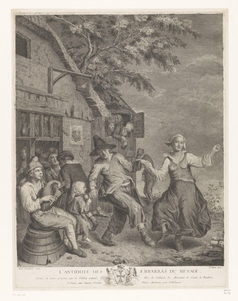 Curator: Welcome. Today we'll be examining Philip Dawe's "The Alternative of Williams-Burg," an engraving from 1775, housed here at the Metropolitan Museum of Art. Editor: What a striking image. The stark contrasts in shading create a really oppressive atmosphere. It feels charged with underlying tension and resentment, despite the rather small size. Curator: Indeed. Let's consider the context. This print likely circulated in response to the growing tensions leading to the American Revolution. Notice how Dawe, through the printmaking process itself, participated in and disseminated politically charged imagery. The lines etched into the metal plate were a means of broadcasting discontent. Editor: Absolutely. The composition is quite effective. You have this clear central focus on the signing, flanked by the crowd on the right and a bizarre tableau on the left—almost stage-like in its arrangement. The artist has created depth through precise line work and strategic use of chiaroscuro. The barrels themselves are an interesting focal point. Curator: Observe that one of the barrels has the inscription "For Joseph Wilks, Esqr, Lord Mayor of London." Consider the implications here: trade, colonial dependency, and the infrastructure required for distributing these materials all underscore the inherent link between commerce and the social order Dawe is criticizing. The very act of engraving allowed these ideas to be reproduced en masse, shaping public opinion through readily available imagery. Editor: Good point. Also note the noose hanging prominently on the right side. The shadow play casts it dramatically in our sightline as if it represents impending doom or punishment, the mood it projects cannot be denied by the visual signs displayed. There’s definitely a statement being made about power and resistance. The artist uses a number of cues here. Curator: These details are crucial for interpreting the historical and material forces at play. How it spoke to the colonial anxieties present and, by means of its tangible circulation, fanned those flames of independence. Editor: The balance in this image, between dark and light, symbol and message, shows off what can be achieved through relatively basic artistic skills. I now have a much clearer idea of the tensions shown here, than when I started out looking at this piece of work. Curator: Agreed. Analyzing the artist's hand and the very material nature of the print truly elucidates Dawe’s participation in the era's debates, providing insight into art and its influence in shaping social consciousness.