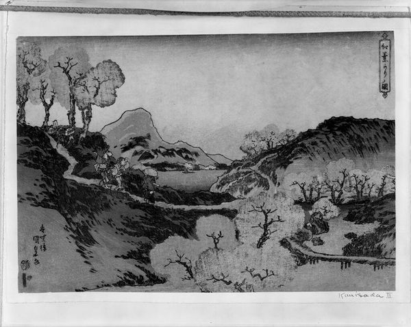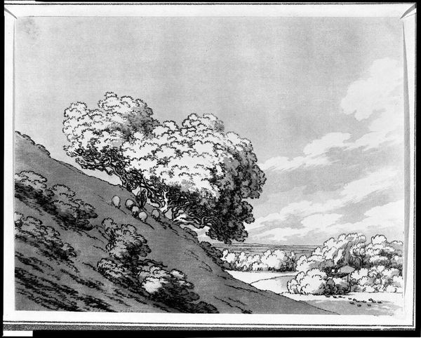 Curator: Here we have a landscape drawing by Ferdinand Kobell. He was born in 1740 and died in 1799. Editor: Oh, it feels like a scene from a dream, all soft edges and blurred lines. Curator: Kobell's known for his etchings and drawings, often depicting pastoral scenes. Notice the cross-hatching; it's really quite detailed, isn't it? Editor: It is. It gives everything this almost tangible texture; like you could reach out and feel the rough bark of those trees. The scale is also interesting. It feels so intimate. Curator: The materials likely influenced that intimacy. The work measures only about 10 by 15 centimeters. Editor: Small, but profound. It makes me think about fleeting moments and how art captures them. Curator: It is a testament to how even simple tools and subjects can achieve something truly beautiful. Editor: Absolutely, a quiet moment preserved.