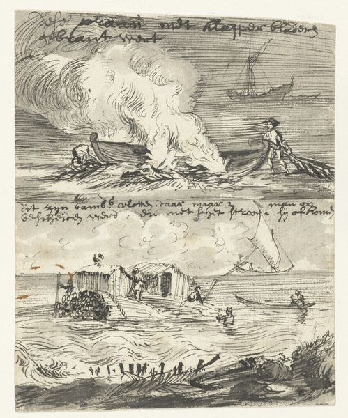 Editor: We're looking at George Cruikshank's etching, "An Eruption of Mount Vesuvius," likely from 1815. The scene is chaotic, almost apocalyptic. There’s this... theatrical destruction, but also a clear satirical intent. How do you interpret this combination of disaster and humor? Curator: It’s vital to understand this print in its socio-political context. Consider the title extends to "… and the anticipated Effects of the WATERLOO Storm.” Vesuvius's eruption likely stands as a metaphor. What do you know about the immediate aftermath of the Napoleonic Wars at that time? Editor: I remember vaguely learning about it. Something about redrawing the map of Europe, new rising empires… Curator: Precisely. Britain, having defeated Napoleon, stood at a crossroads. Cruikshank, a prolific caricaturist, uses the volcano as a visual representation of political upheaval. Those falling figures – are they generic victims, or do they represent specific political figures, possibly connected to France or Napoleon's shattered empire? Editor: I see figures tumbling from the sky on the left! That seems to be answering my questions, possibly alluding to specific politicians of that time. Is the erupting volcano also a commentary on Britain’s role as an emerging superpower? Curator: A compelling reading. It suggests a concern about the social impact of a political change. By combining the imagery of natural disaster with political caricature, Cruikshank tapped into widespread anxieties about the future political and social order. Consider how prints like these, circulated widely, shaped public opinion. Editor: I see the humor now as a way to engage the public, a form of visual political commentary. It’s more than just a historical depiction of an event; it’s an editorial statement. Curator: Exactly. These satirical prints remind us that art isn’t created in a vacuum; it’s part of a broader conversation about power, society, and change. This was all very insightful; thank you.