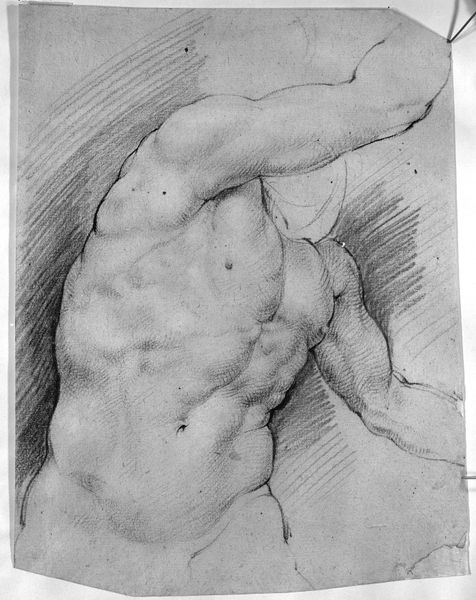 Editor: This is Annibale Carracci's "Triton Sounding a Conch Shell," created around 1597, a pencil drawing. The figure is really striking and muscular. What can you tell us about the context around it? Curator: It’s fascinating to consider this drawing within the context of late 16th-century artistic dialogues. Carracci, deeply rooted in the Italian Renaissance, here pulls on Mannerist conventions but infuses it with his own sensibilities. How might the mythological figure of Triton, often depicted as a subordinate sea deity, challenge or reinforce the social hierarchies of his time? Editor: I see. It is interesting that the pose is not very heroic. What do you mean by reinforce? Curator: Consider how idealized male nudes like this often served to embody power and authority. But Carracci's choice of Triton, not Poseidon himself, could be a subtle commentary. Are we celebrating divine power or interrogating its perceived perfection? Is this idealized masculinity accessible, or is it presented in a manner to highlight the difference between divinity and human condition? Editor: That’s a really interesting point. I guess I had never really considered those social dimensions within mythological painting. Curator: Exactly. And notice the drawing style. The emphasis on musculature, while classically inspired, verges on the exaggerated, a common trait in Mannerism. How does that stylistic choice impact our reading of the figure's virility, for example? Does it become almost grotesque, thus disrupting our comfortable consumption of ideal forms? Editor: So you're suggesting that Carracci is engaging in a kind of…subversion through this drawing? By tweaking conventions to reveal underlying tensions about class and power? Curator: Precisely! It's in these subtle visual cues that we find avenues for deeper intersectional interpretations of art. Hopefully this analysis reveals how the artist not only inherited existing cultural conditions, but engaged with its political context by pushing at its boundaries. Editor: That makes so much more sense now. Looking at it again, I can really see that play between idealization and almost, like you said, a distortion of form. It really broadens how I understand Renaissance drawings! Curator: Art gives us so much when we begin to interrogate its foundations and contexts, who benefits from the work, who suffers because of it, and who engages and has agency. It challenges us.