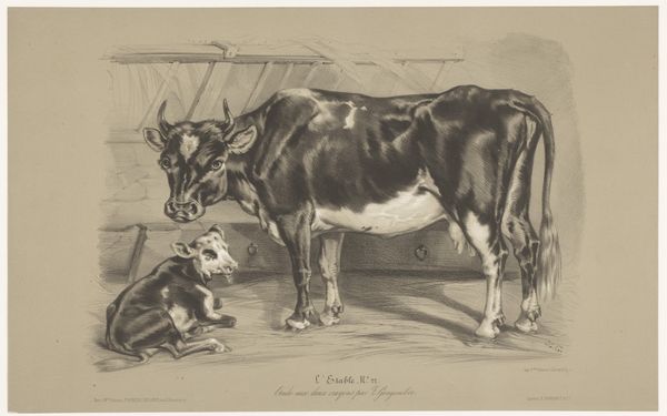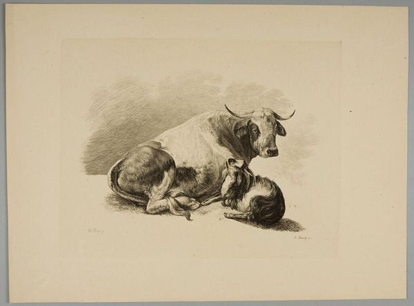 Curator: I’m immediately drawn to the intimacy captured in this drawing; it feels almost like a genre painting, a snapshot of rustic life. Editor: Indeed. We’re looking at “Cow and goat lying down,” a pencil drawing completed around 1800-1801 by Adam von Bartsch. It is now housed here at The Metropolitan Museum of Art. Curator: The placement is intriguing. Look how the forms lean into one another: the dog presses up on the much larger cow. What does it mean for such different animals to rest together this way? The scale is fascinating! Editor: Precisely! Note how Bartsch masterfully employs light and shadow. The way he models the musculature of the cow using the hatching and cross-hatching lines gives it a strong three-dimensionality, anchoring the animal. In comparison, the lines describing the goat are much finer, adding to a visual distinction that emphasizes the difference between the figures. Curator: Perhaps this image speaks to the theme of harmony in nature. Or the old symbolic association of domesticated animals evoking peaceful coexistence and even idyllic rural life. Editor: Maybe so, but structurally the darker tones behind the cow also serve to lift the image from feeling flat and creates depth to emphasize the two resting figures. The lines of energy travel throughout, unifying all the forms and the image. Curator: Still, there’s a real gentleness evoked through this unassuming vignette, especially considering the era it was created within and all that could potentially stand to be lost within times of unrest. I think we're given the chance to witness care across the species barrier, no? Editor: Perhaps. Ultimately, Bartsch gives us a clear understanding of weight, form, and shape using pencil as a surprisingly deft and agile tool. Curator: Thank you! This makes you see the tenderness in this small piece as truly lasting, regardless of the ages. Editor: My pleasure!