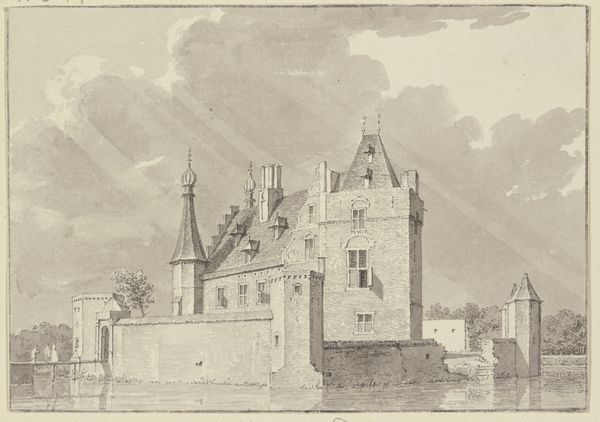 Editor: This watercolor and ink drawing, "View of Kasteel Buren" by Roelant Roghman, was created around 1646 or 1647. The tones are incredibly delicate, almost monochromatic, giving it a slightly melancholic feel, don't you think? What do you see when you look at this drawing? Curator: The almost scientific precision in rendering the castle’s architecture is what strikes me foremost. Roghman meticulously details the geometric forms: the cubic masses of the towers, the sloping planes of the roofs, and the regular grid of windows. Note how the reflection in the water amplifies these forms, creating a kind of visual echo. It’s fascinating. Does the rhythmic repetition draw your attention? Editor: It does, now that you mention it. It's like a study in geometry. It also has this subtle push-and-pull because of the darker foreground against the faded whites of the castle and muted sky. Is that deliberate, or just an effect of the materials aging? Curator: An intriguing observation. The darker foreground acts as an anchor, stabilizing the composition. It’s difficult to ascertain authorial intention regarding aging. Yet, we can assess that the subtle gradation of tones suggests a sophisticated understanding of light and shadow and perspective. Are there further elements of the piece that seem intentional to you? Editor: The bridge definitely seems intentional, connecting the solid landscape to the architectural geometric castle… I hadn't noticed it was almost at the center. Curator: Exactly. The bridge not only disrupts what could be monotonous vertical symmetry, but draws the viewer’s eye to a meeting point – almost like an invitation. It adds another layer to what at first viewing seems like a standard architectural study. Editor: So much more than just a picture of a castle! I hadn't really thought about the intention behind the composition so deeply. Curator: It is through rigorous formal analysis that we uncover the rich layers embedded in works of art.