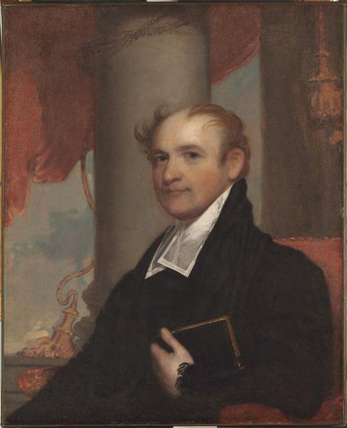 Curator: This is a portrait of John Thornton Kirkland, painted by J. Whitfield. The dimensions are modest: 35.7 by 29.2 centimeters. Editor: The gaze is immediately striking—direct, but with a hint of melancholy. There's a tension between the formal composition and a vulnerability in the eyes. Curator: Kirkland was, of course, a prominent figure in the early 19th century, serving as the president of Harvard University during a period of considerable transformation and modernization. Portraits such as this reinforced the status of prominent figures. Editor: And the formal qualities support this. The subdued palette, the subtle play of light on the face. Notice the carefully rendered layers of the collar, each fold suggesting a specific social positioning. Curator: Indeed. The painting presents him as a man of intellect and authority, aligned with the values of the institution he led. It's a visual statement of power. Editor: It leaves me contemplating how much a portrait can both reveal and conceal about the sitter's true character. Curator: A perennial question when considering the relationship between art and its historical context.
