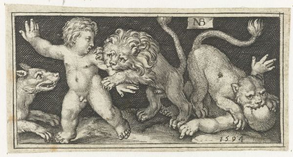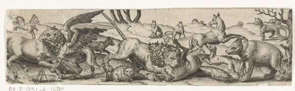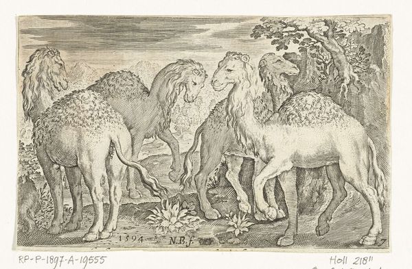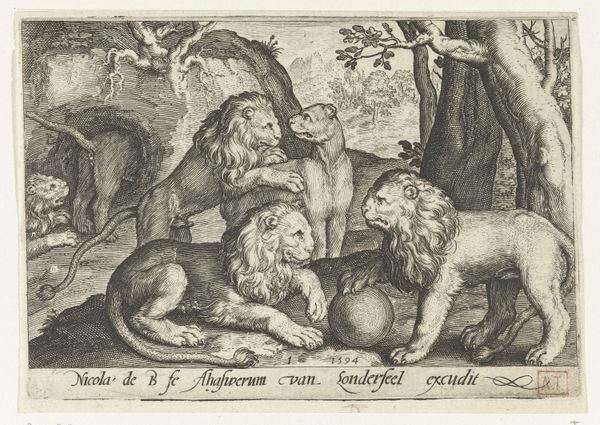 Curator: Initially, one notices the intricate lines and shaded textures; the engraving gives a very crisp rendering to these lions in their natural setting. The print "Leeuwen," dating from 1594 to 1621, and attributed to Nicolaes de Bruyn. This engaging tableau resides here at the Rijksmuseum. Editor: My immediate impression is one of contained power. There’s a quiet strength radiating from these animals, even the cubs partially obscured by the mature lions in the pride. The image feels rather peaceful, and maybe even idyllic, though I imagine real life wouldn’t have been like this! Curator: It’s true, and within the frame of this particular composition, we’re offered an image far removed from colonial fantasies around nature or empire. Looking closer, the work complicates any simplified understanding of lion symbolism during this early modern period. How does the depiction disrupt contemporary understanding about depictions of power? Editor: Interesting, and relevant to the symbolism is that curious orb resting beneath one lion’s paw. A symbol of the world, maybe, dominated by nature's order? Consider too that the animals themselves act almost like heraldic symbols, each mane carefully detailed, conveying nobility but within an almost domestic sphere. It is like we are invited into their realm... Curator: Right—it shifts from aggressive dominance to familial governance—an intentional deflection perhaps. These nuances resist easy interpretations, inviting us to deconstruct simplistic notions of control, whether ecological or political, at a crucial moment in Dutch history of natural exploration. There’s something radical about that softened edge in art production. Editor: And that speaks volumes—a complex representation challenging inherent power dynamics. I would suggest the scene reflects both the external reach and also maybe mirrors internal civic pride of that same era? Either way, the artwork's complexity resonates far beyond a simple image of majestic beasts. Curator: Exactly! Through layered meanings we confront not only art but also histories intricately intertwined. Thank you. Editor: An encounter proving once more that symbolic reading allows critical, engaging, revisioning, reminding of history’s ongoing dialogues.