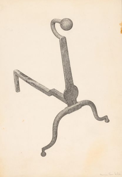 Curator: This graphite and pencil drawing from around 1938, by Jack Staloff, is titled simply, "Andiron." Editor: It has a somber, sturdy elegance. A real weight, even in graphite, if that makes sense. It makes me want to build a fire, even though it's just a picture. Curator: Staloff's handling of light and shadow gives a pronounced volumetric feel to the geometric solidity of the ironwork, achieved through careful gradation and considered realism. The piece’s value structure and arrangement is what really caught my eye initially, especially how form manifests from darkness and then dissolves gradually. Editor: I love that the artist didn’t pretty it up; there’s this almost brutal honesty in depicting this humble object, its texture, almost rough. There is almost something timeless about a solid geometrical shape combined with very tactile details that create the andiron. Curator: Certainly, one sees here an exemplar of straightforward object representation – a devotion to realistically illustrating material form through strictly observed gradations of light across the iron object’s faceted head and cylindrical structure, and how it mediates one's phenomenological perception. There's nothing superfluous or stylized about this work. Editor: Precisely. I love the quiet, almost meditative observation. To sit with something this common, this utilitarian, and find something worthy of translating it into art – that’s compelling. It suggests that beauty or worth is there for us to find if we stop to see it. You look at this and, it’s an ordinary object made somehow extraordinary, just by looking closely. Curator: Yes, the artist’s rigorous examination and depiction elevates the quotidian. The drawing compels the viewer to perceive structural and elemental features of quotidian industrial design often ignored or dismissed, an approach reminiscent of analytic cubism and pre-war functionalist principles of formal construction. Editor: Thinking of sitting by the fire makes you want to be still and present in that warmth. The artwork’s beauty encourages me to reflect more. Curator: A most stimulating engagement! Editor: Indeed, a rewarding observation.