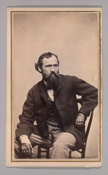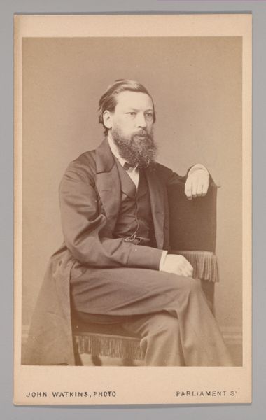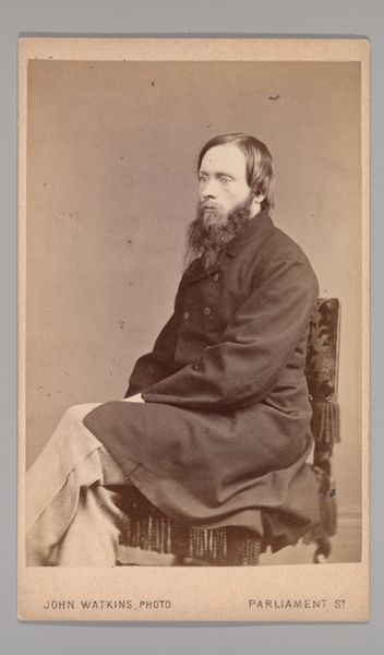 Curator: It strikes me as very... serious. Somber, almost. Editor: Indeed. Here we have a gelatin-silver print from the 1860s, a portrait attributed to John and Charles Watkins. Its subject remains unknown. The formality in the pose speaks volumes about the period. Curator: Absolutely. He's sitting very upright, stiff almost. What stories are hidden in those eyes and that neatly kept beard? I bet he wanted to present himself as trustworthy and dignified. Perhaps that explains his somber mood? Editor: Precisely. This portrait serves as a cultural marker; consider how beards signify wisdom, respectability, or even a certain degree of artistic inclination. Curator: His clothing seems practical, warm even. It looks heavy. Editor: Yes, practical perhaps to emphasize his connection with reality, rejecting frivolous associations. He exists as the backbone of burgeoning industrialisation. The Romantic style in the portrait seems a little at odds with what is, to all accounts, quite a direct photo. But then, in its day, photography was finding its place amidst art. Curator: Is there something melancholic about these early portraits in general? Photography promises a kind of immortality, doesn’t it? Editor: In that melancholia resides the realization that immortality is ultimately out of reach. It offers only a frozen instant. The symbolic weight here really points toward themes of memory and societal expectations, rendered visible in the subject's posture and expression. Curator: Well, that’s put some things into perspective for me! It looked, at first, like someone's grumpy uncle! Editor: Ah! But there's more there than meets the eye. These historical photographs, even in their limited scope, serve as invaluable tools for deciphering not only the surface appearance, but also the social and cultural fabric from which these individuals emerged.