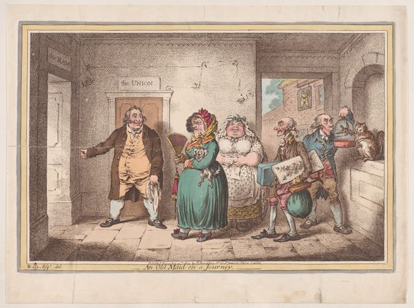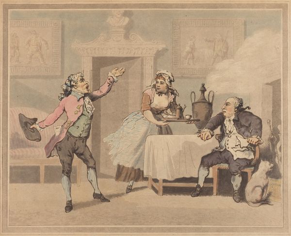 Thomas Rowlandson etched and hand-colored “Doctor Syntax- Disputing His Bill with the Landlady,” in England, at the turn of the 19th century. It presents a scene of social satire, characteristic of Rowlandson's style, which thrived on the exaggerated portrayal of English society. The image depicts a dispute over finances, a common theme reflecting the economic tensions of the time. Doctor Syntax, comically elongated, embodies the persona of the educated class, detached from practical matters. The landlady, drawn with harsh features, symbolizes the working class struggling to make ends meet. This conflict plays out against the backdrop of the English inn, a space of social exchange and economic transaction. Rowlandson critiques the societal norms through caricature. By exaggerating the figures and their interactions, he highlights the disparities and absurdities of social class. This artwork offers valuable insights into the social dynamics of 19th-century England. Art historians often consult period literature, economic records, and social commentaries to enrich our understanding of images like this one.