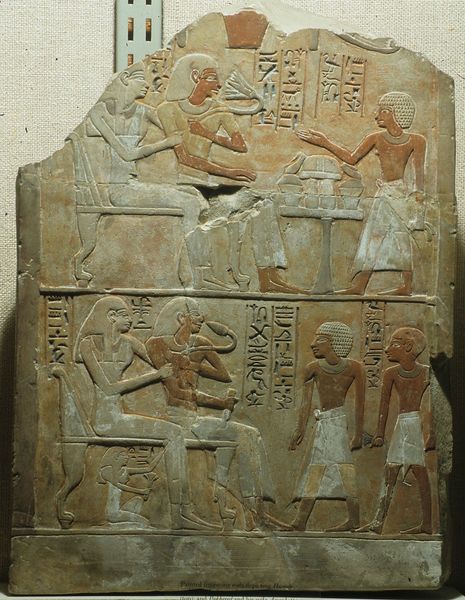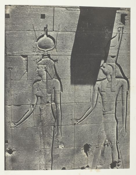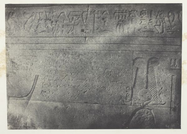 Curator: This arresting print before us, "Palais de Karnak, Sculptures Extérieures du Sanctuaire de Granit; Thèbes," is attributed to Maxime Du Camp, dating back to possibly 1849-1852. It's a photographic print capturing relief sculptures from the Karnak Temple complex. What strikes you first about it? Editor: The sheer stillness. Despite being a reproduction of a bustling place of worship, it projects a potent sense of monumental silence. The grayscale and the coarse texture enhance that feeling. Curator: Absolutely. It's worth noting Du Camp's role in documenting Egypt at a time when photographic technology was nascent. He was part of a French mission that aimed to archive Egyptian monuments, which would become crucial for Western understanding and, inevitably, its political relationship with Egypt. Editor: Observe the formal composition though. The placement of the figures within the frame and their spatial relationships evoke a sense of measured order, classic Egyptian aesthetic sensibilities at play. And consider the varying heights of the crowns, they lead the viewer’s eye deliberately upwards. Curator: True, but this photograph, exhibited back in Europe, also served to legitimize French cultural and political influence. The photographs helped fuel the “Egyptomania” gripping Europe, driving both tourism and colonial aspirations. The Temple suddenly turns into an exhibition, and a piece of propaganda. Editor: Intriguing perspective! I was more focused on the internal semiotics, the visual grammar. Take the repetitive hieroglyphs framing the figures; they lend an abstract yet decipherable texture, forming both image and text in unison. The medium, photography, highlights every etched line with remarkable fidelity. Curator: But whose gaze and whose agenda determined what was captured and how it was framed? Consider the very act of extracting these sculptures from their geographical and cultural setting and presenting them as isolated images shifts their meaning considerably. Editor: No doubt. But from a formal standpoint, the play of light and shadow alone shapes our interpretation. Light rakes across the carvings, emphasizing the depth of the relief and animating forms in the grayscale that we know where once surely colored, or gilded. It almost renders time as a sculptural component. Curator: A valuable point about time’s impact! Overall, this photograph signifies not merely a recording but an interpretation deeply embedded within a specific political context. Editor: Agreed. While the surface simplicity attracts, understanding how these details communicate their cultural richness brings so much depth.