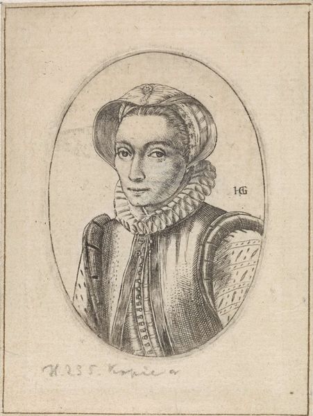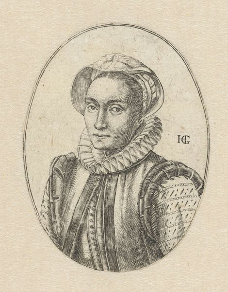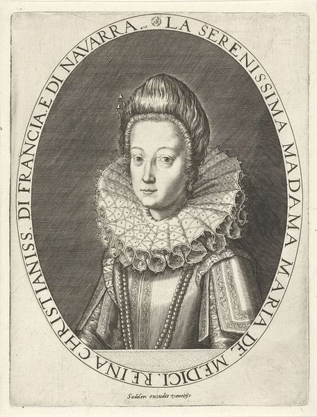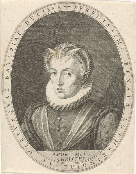 Editor: This engraving by Dominicus Custos, titled "Portret van Renata van Lotharingen", dates somewhere between 1579 and 1615. It’s quite formal and reserved, typical of portraiture, I guess. How would you interpret this work, particularly considering its historical context? Curator: Well, this portrait presents an opportunity to consider the public role of images, especially those depicting women of power. Note the elaborate dress and inscription, which speak to Renata’s status as Duchess of Bavaria. What do you think the function of this print would have been at the time? Editor: To broadcast her status, maybe? Or solidify an image of the family? It seems almost like propaganda now that I think about it. Curator: Exactly. Printmaking allowed for wider circulation of imagery and thus, ideas. These portraits, produced in multiples, were crucial tools in shaping public perception and reinforcing social hierarchies. The very act of creating and distributing such images reflects a carefully constructed narrative around power, lineage, and legitimacy. Editor: So, it's less about capturing an individual likeness and more about crafting a persona for public consumption? Curator: Precisely. The Northern Renaissance portrait wasn't just about appearances; it was a calculated display of authority within the intricate political landscape of the time. Considering this, how does your understanding of the work change? Editor: It makes me see it with a new lens. It isn't simply a portrait; it's a strategic communication tool. I hadn't considered the influence of printmaking in spreading the image of power beyond the noble court. Curator: Indeed. Looking closely at such portraits reminds us how profoundly art is intertwined with power, influencing societal norms. It certainly gives food for thought!