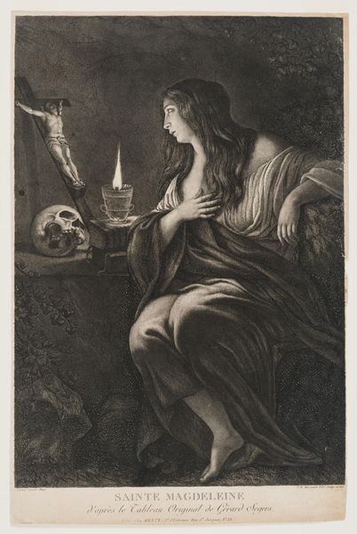 Jacob Gole created this engraving, "Boetvaardige Maria Magdalena," sometime between 1660 and 1737. The image presents Mary Magdalene, a figure often associated with repentance. During Gole’s time, portrayals of Mary Magdalene frequently walked a tightrope between acknowledging her past and emphasizing her role as a devoted follower of Christ. Here, she's depicted with symbols of repentance—a skull representing mortality and a book suggesting spiritual devotion. The composition invites reflection on themes of sin, redemption, and the complex negotiation of female identity within religious and social contexts. The emotional weight of the image lies in the tension between worldly associations and spiritual aspirations, asking us to consider the multifaceted nature of repentance and transformation. Does this image merely perpetuate traditional representations, or does it offer a more nuanced narrative of a woman navigating her faith and identity?