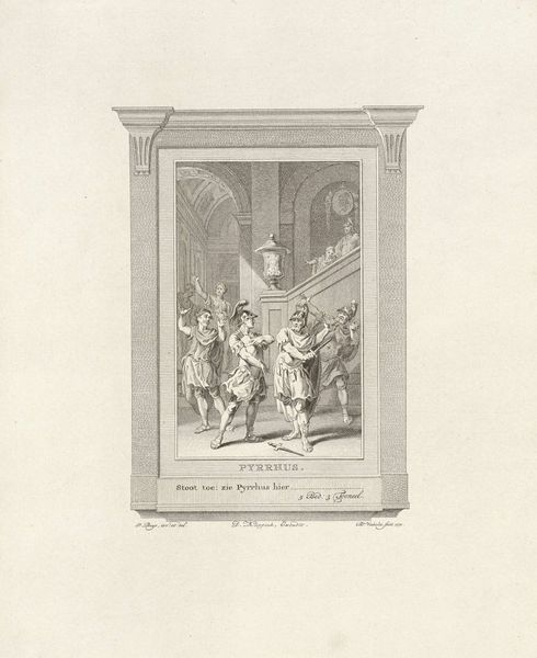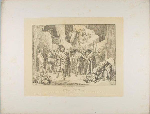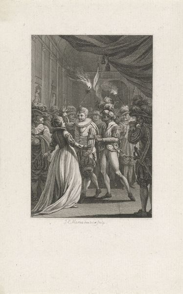 Editor: This is "Koning Willem I met een knielende vrouw," an engraving from 1829 by Jean-Louis Van Hemelryck. It strikes me as a rather theatrical scene, the woman kneeling before the King. What story do you see unfolding here? Curator: Indeed, the composition speaks volumes. Consider the kneeling woman—her posture is a potent symbol of supplication, but what is she asking for? Her placement before the King, surrounded by guards, creates a distinct visual power dynamic. Look at their faces. Do you think they display concern, pity, dismissal? It invites us to ponder themes of justice, mercy, and the role of the monarchy. Editor: I hadn't thought about their faces. The King appears relatively impassive, but you are right; there's a whole narrative embedded in the arrangement of figures and their expressions. Is the text under the print, "Bonne femme en se met a genoux devant Dieu et non devant des hommes, expliquer votre objet de votre demande" supposed to indicate some relationship with divinity, then? Curator: Precisely! The French inscription further complicates matters. The line encourages a relationship between her motivations for humility to a higher calling that she can only appeal to God rather than her fellow men in the line of guards surrounding the King. Van Hemelryck asks: Does the subject deserve justice only from above? Editor: So, the symbols of power are used ironically here. It's far more complex than I initially thought! I see the use of religion and governance as another layer into what might have been previously construed. Thanks! Curator: You’re very welcome. Sometimes, engravings hide so much in plain sight, waiting for us to look closely at how these symbols carry stories.