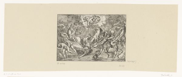 Curator: Welcome. The print before us, "Overstroming bij vruchtbare grond," or "Flooding in Fertile Land," was created sometime between 1800 and 1850 by the Monogrammist AG. Editor: It strikes me immediately as quite apocalyptic, though perhaps in a manner both solemn and slightly absurd. Curator: The artist uses etching and engraving to produce strong lines. Structurally, the composition divides rather dramatically into three distinct zones: a turbulent sea, an earthly realm with figures and allegorical objects, and finally, a divine plane above. Editor: Right. What’s striking to me is how it reflects a period wrestling with power and upheaval. On one side we have this patriarchal Neptune figure causing the deluge, while on the other, more classically feminine images, but each feels related to very specific concepts around religious strength and terrestrial rewards or the earthly bounty and labour of womanhood. It is a visual representation of the social hierarchy, particularly for women. Curator: Certainly, the engraving deploys a rigorous semiotic system. The eye beaming divine light from above and Neptune representing chaotic natural forces create an interesting tension. But also consider how each section exhibits clear lines of perspective and uses line weights for clarity, even amidst the visual density. Editor: I read the chaos differently, and even politically. Here the deluge is maybe an historical flood that erased local economies of the working classes and landed gentry alike, where only divine power can create and assign a new kind of social contract for its citizens. Curator: Note how the sharp hatching technique provides the texture and a sense of tonal variation, despite the absence of color. A fascinating formal demonstration! Editor: In seeing how the light shines down, but more figures of angels appear in each section, maybe there is a visual analogy there for the ever presence and importance of some idea of divinity to most, if not all levels of social existence represented. Curator: A fitting conclusion. It is rewarding to notice how artistic styles and contemporary concerns intertwine when interpreting art. Editor: Absolutely. Context gives art purpose that speaks in varied voices and languages for an array of modern viewers.