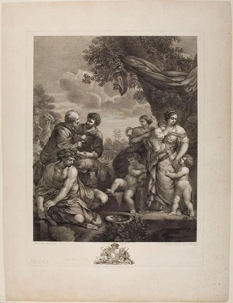 Curator: This is Andreas Schmutzer's "Decius Mus Addressing His Soldiers." Schmutzer, active in the early 18th century, captured what appears to be a pivotal moment of Roman military history. Editor: The image feels incredibly staged, even theatrical. I'm immediately drawn to the central figure, draped in what looks like an animal pelt. What's the symbolism there? Curator: Indeed, the animal pelt serves as a marker of heroism, perhaps referencing the ancient warrior archetype. But let's consider the power dynamics embedded within this image. Decius, elevated on a pedestal, literally embodies authority, speaking to his soldiers before what is meant to be a strategic sacrifice. Editor: And what about the other figures? Notice the contrast in their expressions. Some seem resigned, while others appear defiant, perhaps indicating a collective acceptance of their predetermined fate. It almost seems to be a reminder of duty in the face of death, a complex reflection on power, masculinity and sacrifice. Curator: The piece, at its core, prompts questions about the social and political constructs of heroism and self-sacrifice, not just within the Roman context but also across different periods and cultures. Editor: It gives us a glimpse into the enduring power of symbols and the stories cultures tell themselves about courage and destiny.