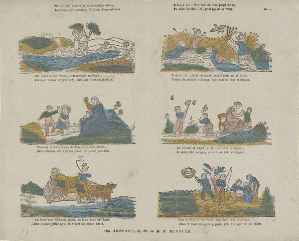 Editor: This is "Verschillende taferelen," or "Various Scenes," by Philippus Jacobus Brepols, created sometime between 1800 and 1833. It’s a print, with pen, colored pencil and drawing on paper. The individual scenes give it an almost cartoonish feel, but I'm struck by the limited palette – the blue, yellow, and reddish-brown repeating throughout. What do you see when you look at this work? Curator: I'm intrigued by the piece's formal construction. Observe the interplay of the curvilinear vignettes against the rectangularity of the supporting sheet. How do the rounded forms of each little tableau affect your reading of them? Editor: I hadn't considered that juxtaposition! They soften the overall effect, making it seem less rigid, perhaps more playful? Curator: Precisely. Note also how Brepols uses line to define form. The lines are rather crude but do establish a definite picture plane. The simple repetition of color adds to the charm, even though one can find areas of clumsy execution. Consider how a more precise use of line and hue might alter the aesthetic impact. Do you agree? Editor: Absolutely, it would feel very different. More refined perhaps, but it might lose some of that immediate appeal. It’s the imperfections that almost make it feel warmer, ironically. Curator: A perceptive observation. By examining its components and their relations, we gain deeper insight into both its strengths and potential limitations, and a greater appreciation for its intrinsic visual properties. Editor: It’s fascinating to think about art in terms of building blocks, thank you. I'll definitely pay closer attention to form and composition from now on.
