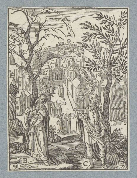 Curator: My first thought? Trouble! Like a morality play condensed into a single, rather scratchy scene. Editor: Precisely! This woodcut, crafted around 1645-1646 by Christoffel van Sichem the Younger, currently held in the Rijksmuseum, is titled "Man wordt verleid door lichtzinnige vrouw," or, "Man being tempted by a frivolous woman." The narrative is key here. Curator: "Frivolous" feels a bit… judgmental, doesn’t it? More like…intriguing! He seems pretty eager to be led astray. The whole composition, with its stark blacks and whites, practically hums with tension. And I find myself almost feeling sorry for him, knowing where this road leads! It’s all a bit foreboding with the contrast of light and dark, creating some interesting shadows that remind of temptation and moral downfall. Editor: The historical context would frame her "frivolity" as actively dangerous to the social order. Baroque art frequently used such scenes to convey moral lessons and reinforce gendered power dynamics. The garden setting, the alluring female figure, the man’s somewhat uncertain stance—it's a visual warning. It could also reference a classic motif from the Old Testament. Curator: A warning… or a bit of naughty fun? Seriously, though, the artist makes great use of the medium, of these lines. I love that he shows, without reserve, the frailty of the characters represented here! And yes, now that you mention, gardens often were presented as a symbol of desire. Editor: The figures dominate the composition, and one notes the use of line and negative space contributes to a potent sense of imbalance. In looking closely we can see how Sichem invites us to recognize the very serious and dangerous circumstances of yielding to temptation. Curator: Exactly. And though it's small and modest, it packs an incredible punch of drama. A little gem of a cautionary tale. Editor: An opportunity, certainly, to reflect on the narratives and biases embedded within art historical traditions, how morality and representation intersect. Curator: Makes you think twice before accepting that second glass of wine, doesn't it?