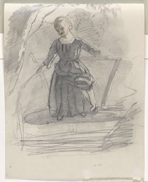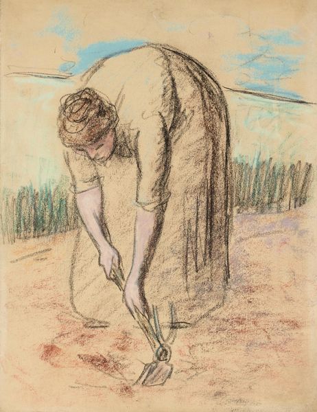 Curator: This is "Haymaker," a work created between 1885 and 1887 by Camille Pissarro, currently housed at the SMK, the National Gallery of Denmark. Editor: Mmm, this has the quality of a daydream... the haymaker, all hunched with this repetitive motion, against this barely-there background. Is that the entire world she knows, or what she allows herself to see? Curator: It evokes, for me, the universal symbol of toil, almost a visual enactment of Sisphus, but softened, made bearable by Pissarro's technique, using delicate mediums like watercolor and pastel. Editor: Sisphus? It doesn't have that heavy, burdensome quality to me at all. If anything, she looks peaceful, integrated with the landscape, doing exactly what she is meant to be doing...there's almost a zen-like state evoked here. Maybe its just the soft lines of the impressionistic technique. Curator: Perhaps what we’re seeing is Pissarro tapping into a deeper mythos. Consider the cyclical nature of farming – sowing, reaping. He gives it a material form, allowing the subject to be simultaneously representative of agrarian activity, yet existing as an aesthetic symbol of it, too. It's the tension between the lived experience and its allegorical representation. Editor: Hmm. It still whispers more about fleeting moments. How the ordinary is saturated with beauty. See, even her hands at work have grace! To me that's what it means to turn toward our ordinary life as the primary material for an art life. Curator: I can appreciate that reading as well, understanding the work's symbolism alongside its quiet intimacy. Editor: Absolutely! Which is maybe why I respond to it more on that visceral level first and foremost. What a marvelous way of capturing daily rhythm. Curator: Well said. It certainly shows us Pissarro's talent to capture both reality and timeless symbolism on the canvas, leaving us something worth contemplating long after we leave this room.