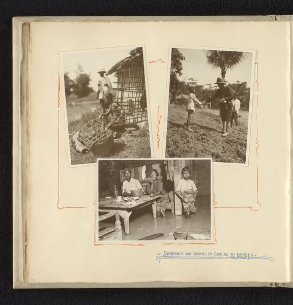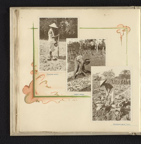 This photograph album page, "Habbema op werkbezoek in Banjir", presents a series of black and white photographs on a light cream page, accented by whimsical green watercolor doodles. It's really about image-making as a way of seeing. I’m drawn to the contrast between the crisp detail of the photos and the spontaneous gestures of the watercolor. The artist uses thin washes to create the bamboo stalks and loose, scribbled lines to suggest foliage and water. It's as if the artist is using the watercolor to bridge the gap between the real and the imagined. Look at how the placement of the photos creates a dynamic composition. They're not just stuck on the page; they're arranged in a way that feels almost choreographed, inviting us to piece together a narrative. It reminds me a little of Joseph Cornell’s boxes, creating a world of images within a defined space. Ultimately, it’s a reminder that art is about embracing the incomplete and the open-ended.