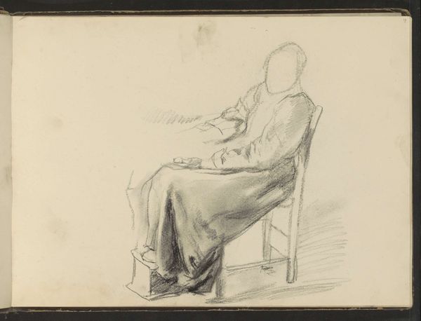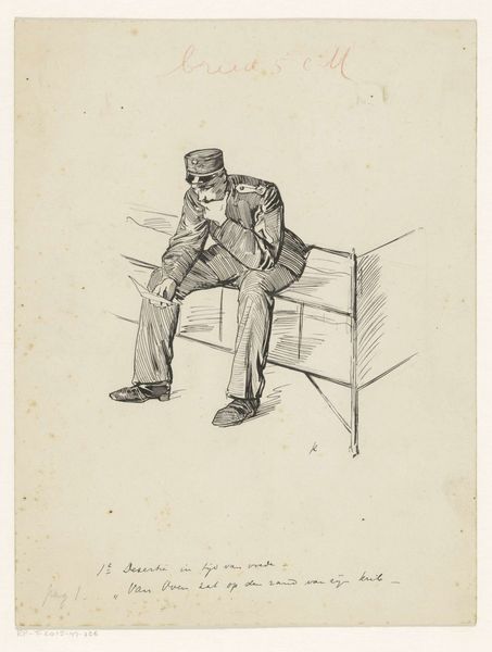 Heinrich Krabbé created this evocative drawing of a soldier sitting on a stool, rendered with ink on paper. Krabbé's work emerges from a historical context marked by significant social changes. This piece offers a glimpse into the life of a soldier, inviting reflection on themes of identity, duty, and the human condition amidst military service. Notice how the soldier is slumped on the stool. His downcast gaze captures a moment of introspection or fatigue, humanizing the figure often associated with strength and rigid discipline. The setting appears sparse, suggesting the spartan conditions endured during military deployment. The drawing style, with its detailed lines, adds to the emotional depth of the subject, emphasizing the psychological impact of military service. Krabbé’s choice to focus on a solitary figure underscores the personal experiences of those who serve. Ultimately, this drawing serves as a poignant reminder of the individuals behind military uniforms, inviting us to reflect on the complexities of identity and the human cost of conflict.