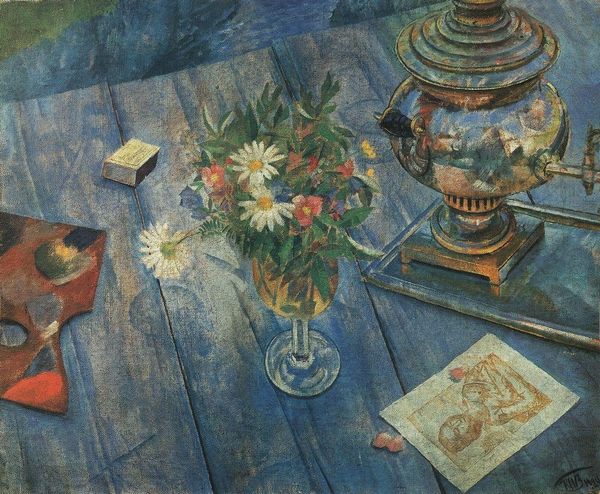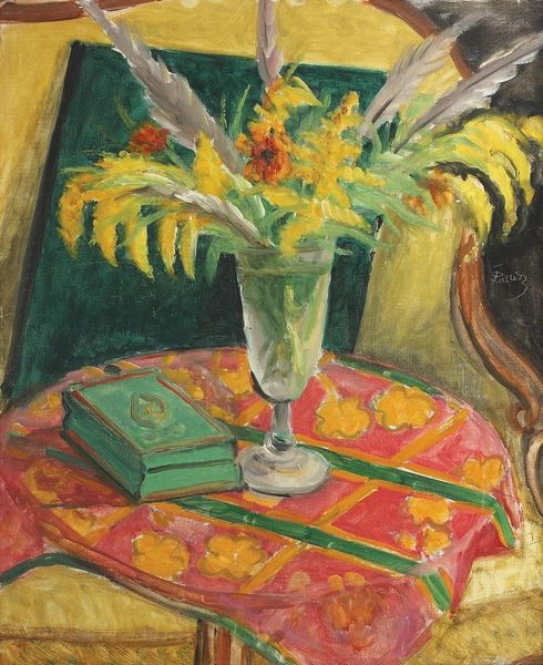 Editor: So, this is Theodor Pallady's "Poppy Flowers," it seems to be oil on canvas, though I couldn’t find a specific date. It's a still life, and the thing that strikes me most is its intimate, almost domestic feel. What do you see in this piece? Curator: Beyond the surface-level beauty, I see a commentary on the role of women in early 20th-century society. The still life genre, often associated with domestic spaces, became a space for female artists, and Pallady, painting flowers and household objects, engages with that world. Does the composition – the balance between the natural, the domestic, and the intellectual - suggest anything about societal expectations or roles to you? Editor: I hadn't really considered that angle. I guess the open book and magnifying glass next to the vase and fruit…it could symbolize intellectual pursuits versus domesticity, maybe? Curator: Precisely! Think about the male gaze and its historical dominance in art. By focusing on traditionally "feminine" subjects, Pallady is inadvertently questioning and subverting those established norms. Does the subdued palette play a role here? How does the coloring create a sense of intimacy, drawing the viewer into this private space? Editor: The colors are definitely muted, almost faded. Maybe it suggests the quiet lives, the unseen labor, that defined women’s roles during that time? It makes you think about the politics behind the imagery in this artwork, like how certain materials are included. Curator: Yes, and think about the "academic art" style that is applied here, and how the application may not be so incidental. Pallady, a male artist, adopting a style associated with female spaces... it adds another layer. Now what do we consider? Editor: That’s really fascinating. I originally saw a simple still life, but now I realize there are complex gender and social dynamics at play. Thanks, that perspective really opened my eyes! Curator: Indeed, that's the power of contextualizing art. It reveals narratives that might otherwise remain hidden, which inspires conversations about how we approach modern gender studies.