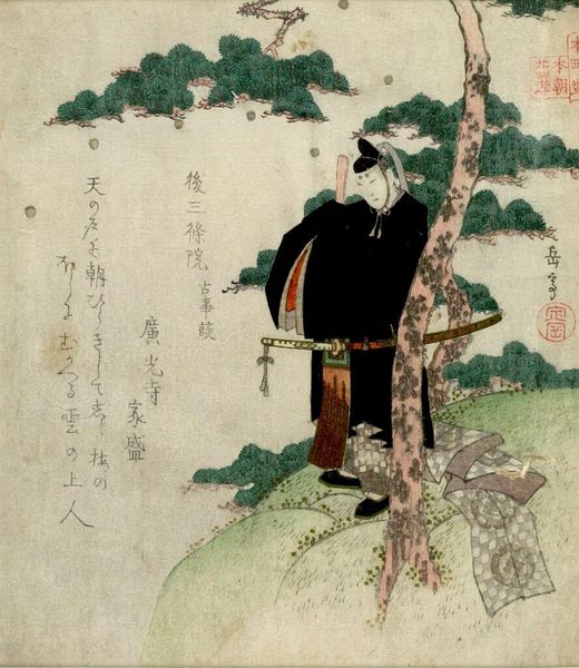 This woodblock print by Yashima Gakutei, showcases a figure dressed in dark robes leaning against a tree. His sword suggests a warrior or samurai status, indicative of his social standing and moral obligations during the Edo period. The sword, a prominent symbol here, evokes images of justice and honour. This iconography is not unique to Japan; across cultures, the sword is a symbol of power and integrity. Think of the classical Greek warriors or medieval knights. Each uses the sword as an extension of their will, imbuing it with similar values of strength and moral authority. The presence of the sword, passed down through generations, is loaded with cultural and psychological weight, resonating in our collective memory. A sense of respect and perhaps fear accompanies the image of the figure, engaging us on a deep, subconscious level. Like a snake biting its own tail, the sword’s representation continues in a non-linear, cyclical progression. It resurfaces, evolves, and takes on new meanings in different historical contexts, continually shaping the cultural landscape.