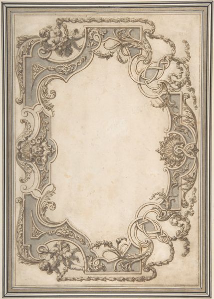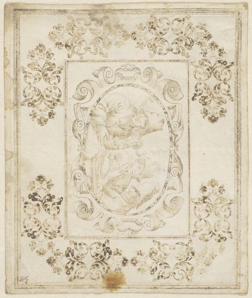 This drawing of a niche surrounded by musical motifs, was created by an anonymous artist. We can see it's made with pen and ink, with a blue wash on laid paper. The anonymous artist has completely filled this sheet with symbolic representation and allegorical figures. The effect is ornate and overwhelming, and the musical theme suggests a celebration of harmony and order. The drawing feels like a preparation for a larger, more permanent work, perhaps a sculpture or architectural feature. Consider that in the Renaissance and Baroque periods, drawings like these were often collaborative efforts. One artist might create the initial design, while others specialized in rendering figures, ornament, or architectural details. This division of labor was common in workshops, reflecting a hierarchical system where skill and expertise were valued but also carefully controlled. So, looking closely, we can appreciate not only the artistic vision but also the complex social dynamics embedded in its making. It challenges the traditional view of the artist as a solitary genius, highlighting the importance of craft, collaboration, and context in understanding the full meaning of this drawing.