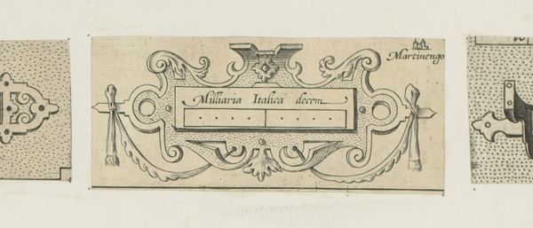 Curator: Let's discuss this engraving, "Cartouche met schelpornament," which translates to "Cartouche with shell ornament," created circa 1572-1575 by an anonymous artist. It's a fascinating example of Renaissance graphic art. Editor: My first impression is that it’s meticulously detailed. There's an impressive precision and intricacy within such a small, contained space. It almost feels like looking at a piece of ornate jewelry or some delicate embellishment. Curator: Precisely. The dense stippling in the background creates a tactile contrast with the crisp lines of the cartouche itself. The balanced composition also lends to this work a serene classicism. The structural elements are pronounced, the curves of the shell balanced against the rigid angles of the frame. Editor: I see the shell not merely as ornamentation but as a layered emblem of pilgrimage and perhaps rebirth, concepts interwoven in Renaissance symbolism. What could this term in the frame, "Miliaria Scotica," signify in relation to that symbolism? Curator: It's likely a reference to Scottish miles, perhaps indicating the cartouche's function as a marker or label within a larger map or document. Notice how the structure, its frame-within-a-frame, serves to literally and figuratively contain and present the text as the object of our attention. Editor: The geometric rigidity is undeniable. It directs my eye, compelling me to acknowledge it as both a unit of measure and a proclamation of national identity. It strikes me that the choice of shell, then, creates a sense of both the familiar and the distant, the local and the far-reaching. Curator: An astute reading. The balance of linear precision against the organic flourish exemplifies Renaissance aesthetics. The visual interplay allows us to interpret a sense of proportion and structure. It represents a harmonious union of elements. Editor: Examining it, I realize this engraving offers more than mere decorative design. It uses these Renaissance elements to convey historical and cartographic significance. The shell provides a visual connection to journeys and distances. Curator: Agreed. Its refined structure and visual clarity give testament to the enduring fascination with symbolic meaning in the early modern era. It elegantly achieves its purpose. Editor: And viewed from that perspective, it serves as a beautiful reminder of how images can hold so many complex cultural meanings within their frames.