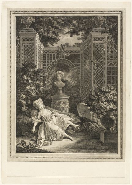 Editor: This is "The Amorous Gardener," an etching by Isidore-Stanislas Helman, created in 1777. It strikes me as a really intimate scene, but the presence of the other woman observing gives it an element of drama. What's your interpretation of this print? Curator: Well, placing it in its historical context, this print belongs to a broader interest in genre scenes, particularly popular during the late Baroque and early Romantic periods. Think about the rise of the bourgeoisie and their interest in depictions of everyday life, often romanticized. Does this imagery reinforce or challenge social hierarchies? Editor: Hmm, good question. I see a couple courting, dressed in what I would guess are middle-class clothes, so I assume they would identify with the intended audience of the etching. But is there a sense of satire, given that they are being observed by another? Curator: Exactly. The composition itself stages the public display of affection. And, what do we know about who was commissioning and consuming these prints at the time? The market shaped the subject and the aesthetic, often reinforcing existing norms while offering glimpses of transgression within safe, artistic boundaries. Where was this displayed, and who bought it? Editor: So you're saying the "amorous" nature is somewhat mediated by its commercial context and reception? It’s less about pure romance and more about a constructed idea of romance for public consumption? Curator: Precisely. Consider the title itself—"The Amorous Gardener." It links love with labor and the pastoral, constructing an appealing narrative for its contemporary audience. The act of observation within the image comments on the act of our observation of the image. What do you make of the level of detail achieved? Editor: It’s beautiful. There's an amazing amount of fine detail, especially in the rendering of the foliage. Knowing now the possible meanings and viewing habits around it, helps to re-contextualize what is on display, but not outwardly obvious. Curator: Right, this level of skill enhanced its market value and contributed to the idealization of the scene, solidifying a vision of both art and life for its public. It serves to reveal the importance of understanding socio-political influences to understand an artwork fully.