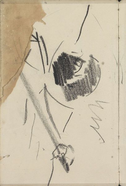 Curator: This pencil sketch is titled "Head of a Girl and a Lower Leg" by Carel Adolph Lion Cachet. It's dated between 1874 and 1945. What are your first thoughts? Editor: I'm struck by its incompleteness, yet the directness of its gaze is somehow haunting. It reminds me of children in my own life. Curator: Yes, the lack of full detail focuses our attention, doesn't it? We see a young girl carried in the arms of the artist’s subject, a stark study in contrast. Cachet emphasizes particular shapes, deconstructing figuration and focusing the form. The lines carry a particular weight and lightness depending on the form that emerges on the page. Editor: Right. It speaks to fragmented memories, the blurred edges of recollection, or the provisionality of care work, doesn't it? What is visible, and what remains unseen or deliberately omitted? Also, who does carry children while their images go unrecorded, unsung? The composition is powerful in the questions that the forms bring to mind regarding social identity and art history. Curator: Absolutely. And it's the interplay of absence and presence that generates such power. Cachet plays with positive and negative space—observing the composition itself through the interaction of the sketched objects. Take, for instance, the solid mass of hair at the top against the negative space in the figure’s attire, it creates a visual vibration. Editor: I wonder, given the time period, is there any indication that the subject may be a working-class domestic servant or caregiver? If so, that dynamic could influence how we read the tenderness or absence we perceive here. In looking for new directions in modernism, who and what has been sacrificed and forgotten? Curator: Interesting thought. Perhaps the figures are more intimately entwined; Cachet obscures easy answers about their precise relations through this sketch, however. Its power relies on that very tension. Editor: So true. By focusing on forms, this piece offers an intense commentary about identity. Curator: Yes. It urges me to study sketches, with all their unfinished potency. Editor: To be aware of our assumptions of care and to continue with radical social politics!