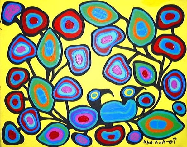 Curator: Today we’re looking at a piece titled “Nature’s Guide” by Norval Morrisseau, painted using acrylic. Editor: Well, it certainly pops. The composition feels both dense and airy with those stylized, interconnected shapes floating against the vibrant orange ground. There’s a tension between the flatness of the color fields and the suggestion of organic form. Curator: Indeed. Morrisseau, as a key figure in the Woodland School, powerfully merged Anishinaabe traditions with contemporary art practices. Consider how this painting intertwines vibrant colors with X-ray style figuration characteristic of his work, giving visibility to inner spirit. We are looking at an interpretation that portrays a spiritual dimension using abstracted figures, notably these water birds. Editor: Those black outlines are doing a lot of work. They create definition, but they also flatten the picture plane. The palette itself—the reds, blues, greens—is deceptively simple. They evoke a specific, almost retro, sense of color harmony, don't you think? The rounded, amoeba-like sections lend a playfulness, belying a potentially deeper narrative. Curator: Absolutely. This seemingly simplistic palette references complex cultural and personal narratives, challenging the Western art world's expectations by centering Indigenous cosmology. We could even consider how the interwoven forms represent relationships, kinship, and ecological harmony. Morrisseau's work serves to decolonize artistic spaces, reclaim cultural identity and advocate for Indigenous sovereignty. Editor: I can see how that focus challenges traditional western conventions, but aesthetically it creates an interesting paradox of form and intent. Curator: Morrisseau has gifted us with a vocabulary to voice the spirit and experiences central to Indigenous identity and rights. The narrative potential in this artwork moves us to acknowledge these stories in a colonial context that all too often represses Indigenous people. Editor: A wonderful opportunity for art to bridge theory and the intrinsic aesthetic. Curator: I agree! It has certainly made me consider different aspects, particularly concerning my understanding and contextualization.