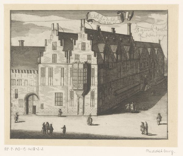This drawing, titled "Gezicht op het Hofje van Hoogelande te Den Haag," is a study in perspective, skillfully executed by an anonymous artist using etching techniques. The work presents a courtyard view, dominated by architectural linearity and receding space. Observe how the structures are arranged to draw the eye toward a vanishing point, creating an illusion of depth on a flat surface. The buildings' facades, rendered with careful precision, demonstrate a commitment to geometric order. Linear patterns define not only the architecture but also the arrangement of figures and vehicles in the foreground. The drawing invites us to consider the semiotics of space. How might the rigid structures and ordered perspective symbolize social hierarchies or the controlled environment of the Hofje? The emphasis on linear precision could reflect the period's broader intellectual trends, such as rationalism and the scientific method. The artwork functions as a discourse on spatial representation and challenges fixed meanings.