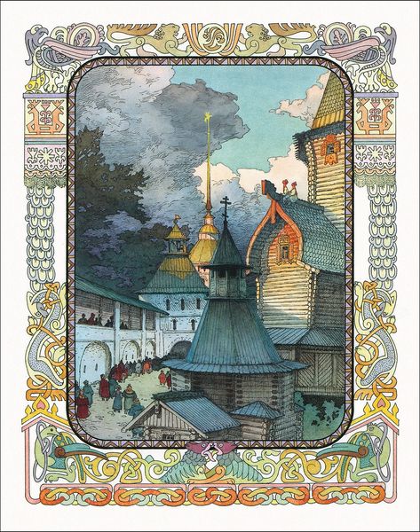 Editor: This is an illustration for "The Golden Cockerel" by Vyacheslav Nazaruk, made in 1999, using tempera. It's very intricate, with a decorative border surrounding the central image of figures on horseback moving through a landscape. It makes me wonder about the detailed craftsmanship and choices around materials for an illustration. What do you make of it? Curator: I find myself drawn to the way the artist meticulously constructed this image. Look at the tempera; consider the labour involved in grinding pigments and applying them in thin layers to achieve that luminosity. Nazaruk isn't simply depicting a scene; he is constructing a material reality rooted in historical techniques, like Byzantine art and miniature painting. Notice the repetitive geometric patterns. What do you think these choices communicate about value, Editor? Editor: It's almost as if the border elevates the central image. And thinking about the medium, tempera, makes me see it as an object, something handmade rather than just a reproduced image. Do you think the combination of traditional methods with a narrative subject serves a purpose? Curator: Absolutely. The material choices become intertwined with the narrative itself. By referencing the artistic traditions and applying them to the book, Nazaruk blurs the boundaries of ‘high art’ and accessible art, such as illustration. It makes you reconsider how illustrations become embedded into commodity and cultural circulation. We might even interpret this as the artist commenting on craft and material in art and challenging us to confront labour behind art. Editor: That’s fascinating. I hadn’t considered the way the materials themselves contributed to that kind of dialogue, and challenged conventional categories in the art world. Curator: Precisely. Nazaruk asks us to examine our relationship with the work by emphasizing the means of production of art.
