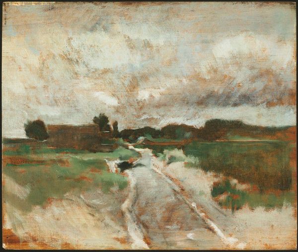 Editor: Here we have Isaac Levitan's "The Halt," created in 1885 using oil paints. I'm struck by how grounded and almost industrial it feels, despite being a landscape. It's not romantic in the way I'd expect. What’s your take on this work? Curator: The apparent simplicity is deceptive. Think about the material conditions surrounding this artwork. Russia in 1885 was undergoing rapid industrialization. This piece isn't just about 'nature'; it's about the imposition of infrastructure upon the landscape. How does the inclusion of the train tracks change our perception of the rural area? Editor: I see what you mean. The tracks and signal disrupt the natural scene. They represent progress, but maybe also at the cost of the untouched landscape. Curator: Exactly. And consider the oil paint itself. Its mass production allowed artists like Levitan to capture these transient moments quickly, facilitating the Impressionistic style. The materials and their accessibility directly influenced the style and subject matter. Does knowing this change your interpretation? Editor: It does. It's not just a scene; it's a statement about the changing Russian landscape and how accessible materials influenced the way artist make art. The artist makes a halt for both landscape and progress. Curator: Precisely! Looking beyond the aesthetic reveals the artist reflecting on those very conditions, making the painting a product of its time and commentary. Editor: This has been incredibly helpful; I’ll never look at landscapes the same way again. It is interesting to consider the labor, resources, and social implications intertwined with every piece of art. Curator: It is a fruitful line of thinking! Seeing art this way illuminates its connection to our shared history.