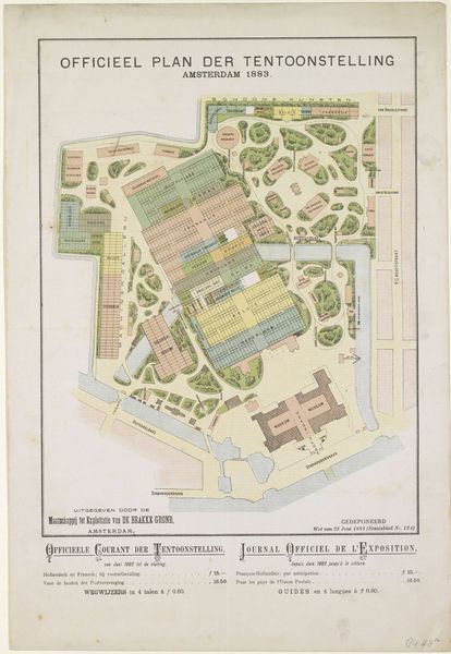 Curator: This mixed-media drawing on paper presents a “Plattegrond van de Wereldtentoonstelling in Amsterdam, 1883," mapping the grounds of the World’s Fair. Editor: It’s charming! Almost dreamlike, really. The pastels give it an airy feel, like a garden fading into memory. Curator: Notice how each country has its own pavilion, distinctly labeled. Japan, Frankrijk (France), England, China. The fair served as a microcosm of global exchange. I'm curious about the symbols embedded within this seemingly objective representation. What ideologies are literally mapped out here? Editor: The organization itself tells a story, doesn't it? With European nations so centrally placed, the visual hierarchy implicitly reinforced existing power dynamics of the time. And look, the "Schoone Kunsten" section gets prime real estate, underlining the supposed value placed on the Western concept of fine art. It's not a neutral plan; it's a statement. Curator: I find myself drawn to the circular forms nestled within, representing various entertainment features—the "Muziek" pavilion and "Volks-Restaurant." How interesting that the map also includes those symbols of enjoyment and pleasure! Perhaps they're a subtle reminder of the utopian dreams of global unity at the heart of the exhibition. Editor: Dreams built on inequitable realities, unfortunately. But maps like this allow us to literally chart the history of colonialism and power relations that continue to influence today’s cultural landscape. Even the botanical art feel carries echoes of colonial exploitation and control. Curator: You've given me new ways to consider how this drawing functions as more than just a document; it also preserves the complex ambitions and ideologies embedded within this singular cultural event. Editor: And I’ve thought more deeply about how even a simple-seeming cartographic drawing on paper, can show the invisible structures underpinning history. Thanks for helping to illuminate all these points, Curator!