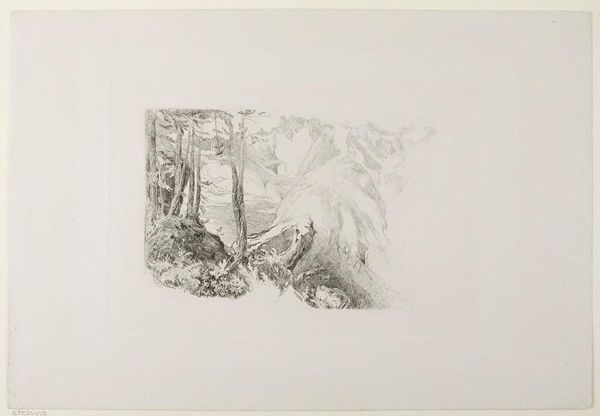 Curator: Let's turn our attention to John Ruskin's rendering titled, "Quivi Trovammo," held here at the Harvard Art Museums. Editor: The skeletal forms immediately suggest vanitas, a memento mori. It’s a very stark image, considering Ruskin's other works. Curator: Indeed, the skeletal reptile is placed precisely in the center, its form echoed and amplified by the swirling lines of the landscape. Notice how the composition draws the eye directly to the creature's spine. Editor: It certainly evokes images of dragons and ancient mythical sea monsters. The piece could be seen as a meditation on time, on the layers of geological memory. Curator: Or perhaps a study of the natural form reduced to its essence. The linearity is masterful. Editor: Well, whatever its intention, the image lingers, provoking thoughts of mortality and enduring symbols. Curator: A thought I share. It offers much to contemplate from both aesthetic and symbolic perspectives.