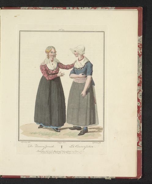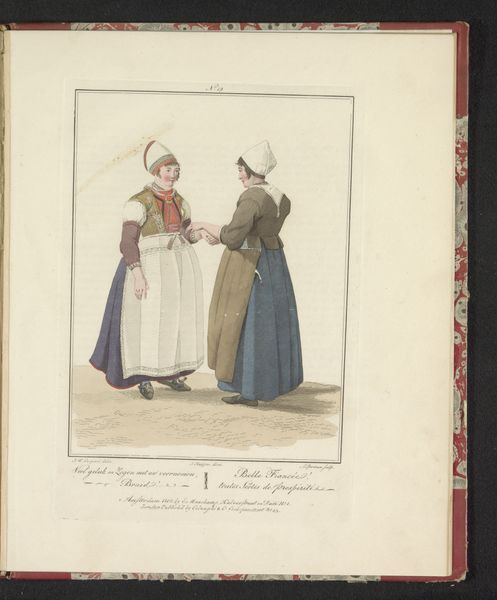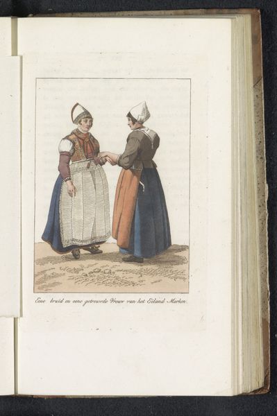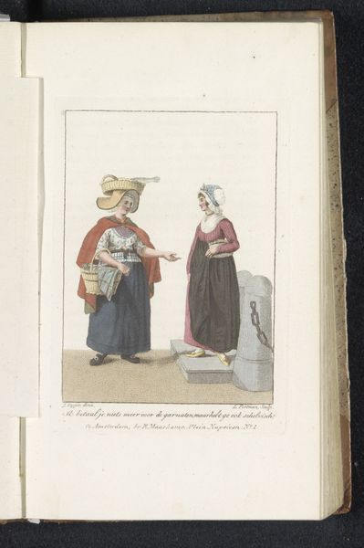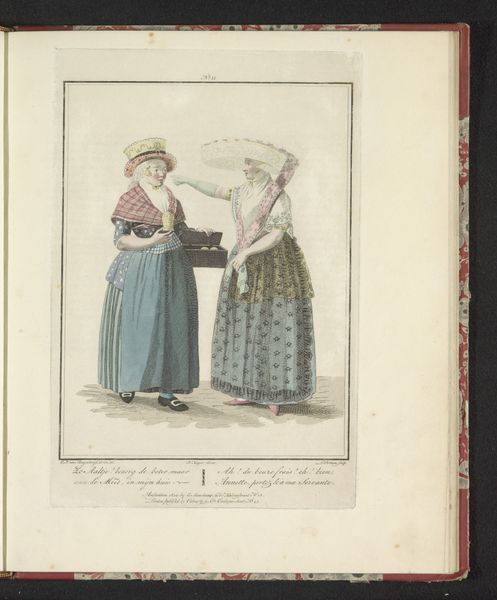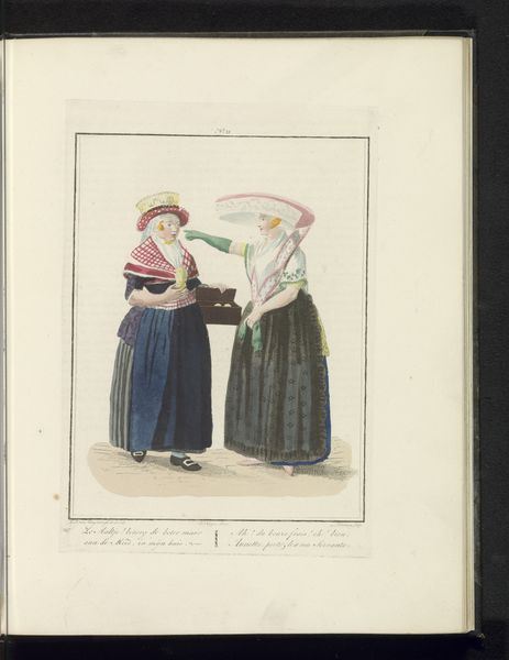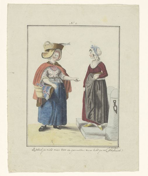 Editor: Here we have Ludwig Gottlieb Portman's "Scheveningse visverkoopster," made in 1804. It’s a watercolor drawing on paper housed here at the Rijksmuseum. There's something incredibly charming and intimate about its scale and the delicate application of colour. I find myself wondering what daily life was like in Scheveningen back then. What catches your eye? Curator: It's lovely, isn't it? This piece whispers stories of a specific time and place. It's more than just a portrait; it's a glimpse into the social fabric. Consider the meticulous detail in their costumes. Note how much personality comes through even in such a relatively simple composition. Editor: It's the hats, for me! The one on the left is almost comical in its size. Is that meant to tell us something about her status, or where she is from? Curator: Ah, you've hit on something crucial! The clothing, the basket she’s carrying… everything is deliberate. These weren’t just women, they were characters being presented. These "types," as they're called, became popular as city dwellers began romanticizing the lives of people who lived in the country and smaller villages. What do you imagine Portman was trying to communicate to his urban audience? Editor: Perhaps a sense of authenticity or a simpler, more "real" way of life? But filtered, obviously, through a very specific lens. Curator: Precisely! We often assume art always intends to tell some "grand truth," forgetting that sometimes art serves other goals. It's fascinating how something so seemingly simple can hold so many layers, don’t you agree? Editor: Absolutely. I'll never look at a "simple portrait" the same way again!
