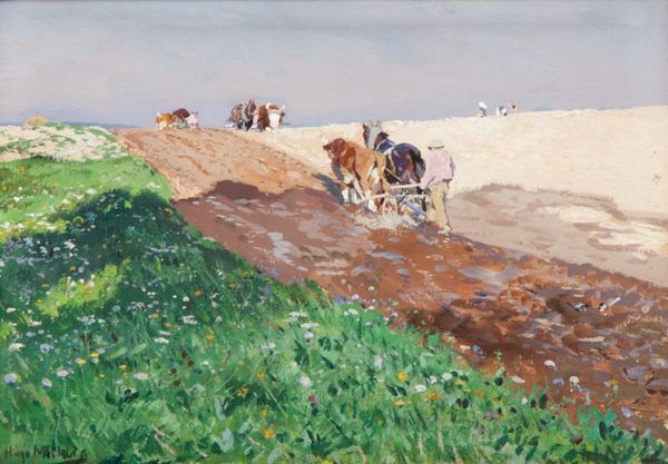 Theodor Philipsen’s "Grazing Cows on the Island of Saltholm" is painted with oils on canvas, a traditional medium, yet the artist’s approach elevates the everyday to a subject worthy of attention. Philipsen's brushstrokes, thick and visible, give texture to the cows’ hides and the landscape. This isn't a smooth, idealized vision of nature; it’s tactile and real. The canvas becomes a field itself, mirroring the one depicted, reminding us of the labor involved in both agriculture and art. Consider the social context: Philipsen was painting during a time of significant agricultural change. His choice to depict working animals in a natural setting carries a subtle commentary on the value of rural life amidst increasing industrialization. The cows aren't just cows; they're symbols of labor, sustenance, and a way of life rooted in the land. Looking closely, you can see how the materiality and making are integral to its meaning. It challenges us to see beauty and significance in the mundane, blurring the lines between fine art and the everyday realities of work and nature.