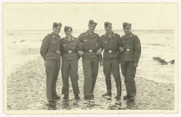 This is an anonymous photograph, 'Groep Wehrmachtsoldaten in een stad', likely a captured moment during a dark period. The image is small, almost intimate in scale, focusing on the faces and gestures of the group of soldiers. There's an attempt at casualness, some men are with arms over each other’s shoulders, but the uniformity of their dress and the hardness of the background suggests something more menacing. I am drawn to the soldier in the middle, his uniform is noticeably different, perhaps suggesting a different role. The monochromatic palette adds to the starkness, reducing everything to tones of gray, black, and white, amplifying the emotional weight. It reminds me of the work of Gerhard Richter, especially his blurred photo paintings, where the act of painting over a photograph introduces another layer of mediation and reflection. This image, like Richter's work, makes you think about the complexities of history, memory, and representation.