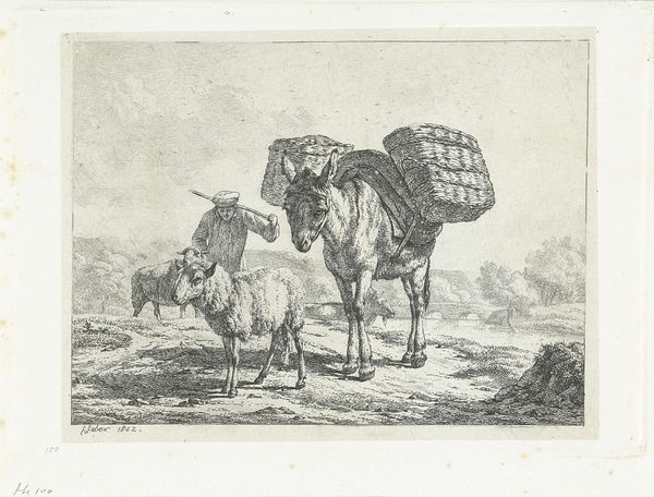 Frédéric Théodore Faber created this drawing, "Two Goats and a Drinking Lamb", using pen in brown and brush in gray. The composition arranges the figures in a simple landscape, dominated by the stark contrast of light and shadow achieved through detailed cross-hatching. Faber has used the line to delineate form and texture, creating a rich visual experience. The goats and lamb are not merely representational; they are structured elements within a carefully constructed scene. The semiotic play here lies in the use of familiar pastoral imagery to question notions of purity and nature. The stark realism destabilizes idealized rural scenes, inviting contemplation on the complexities of existence. The choice of monochrome underscores the structural elements, prompting us to analyze how form dictates content. Note the intricate detailing of the goats' fur and the rough terrain. These formal choices invite us to reflect on how such aesthetic elements serve broader cultural and philosophical inquiries. Art perpetually invites new interpretations, enriching our understanding of both the artwork and ourselves.