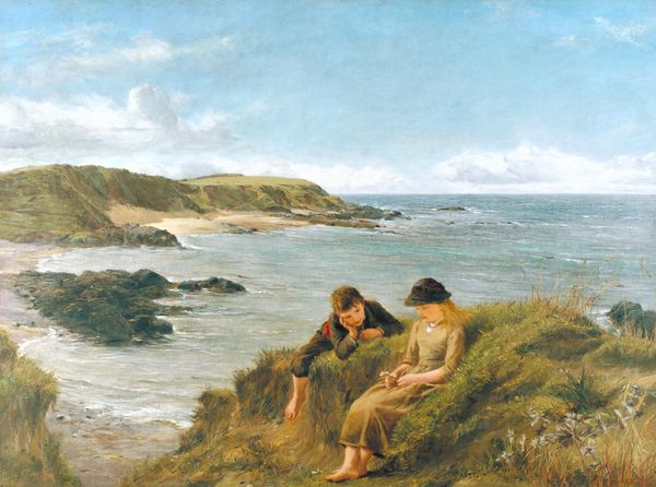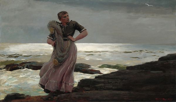 Editor: So here we have Waterhouse’s painting "Miranda". There isn’t a date for it, but it's oil paint on canvas. The first thing that strikes me is how incredibly pensive it feels, that stormy sky just adds to the mood. What do you see in this piece, beyond the surface of a young woman staring out at the sea? Curator: It's all about confinement and longing, isn't it? Waterhouse often explored themes of women trapped by fate or circumstance. He paints women suspended in some kind of psychological torment that stems from either societal expectations or dramatic turns of event. Notice how the Pre-Raphaelite attention to detail emphasizes her isolation— the crashing waves mirror the emotional turbulence within her, as if she's having to surrender and resign herself to her loneliness. Tell me, what does her physical placement on the rocks communicate to you? Editor: Good point! She’s literally caught between the land and the sea, isn't she? It makes me wonder about her story – what is she waiting for? The overall color palette further speaks of the kind of emotional landscape she's immersed into. There are also narrative elements in this artwork, what is the symbolic meaning behind them? Curator: Yes, it also reminds me of similar themes we see in folklore stories such as Celtic mythology. The symbolism, with its heavy sky, can relate to hidden secrets or mysteries that often occur in folklores, what’s unknown lurks there, on the verge of showing. The sea itself can stand as some sort of journey, of long travel that feels neverending when hope abandons you. I also see an invitation from the author to think, imagine a story for Miranda. What do you feel? Editor: Definitely agree about the ambiguity – it's up to us to fill in the gaps, to create our own version of Miranda’s story. That open narrative adds a lot to the piece's timelessness, I think. It certainly made me look past what's shown!