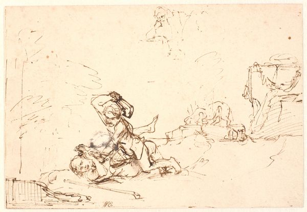 Salvator Rosa made this pen and brown ink drawing of five figures with dogs sometime between 1635 and 1673. Rosa's choice of pen and ink provides a directness, emphasizing the artist's hand and process. With energetic lines, Rosa delineates figures in elaborate costumes, capturing their dynamism and theatricality. The brown ink, applied with varying pressure, creates depth and shadow, enhancing the drama of the scene. The fluidity of the ink allows for quick, expressive strokes, perfectly suited to capturing fleeting moments. The density of the lines suggests that Rosa worked at speed, as though trying to capture a transient moment of inspiration. Rather than aiming for polished refinement, Rosa embraces the immediacy of the medium, prioritizing spontaneity and expression. By focusing on the techniques and materials employed, we gain a deeper appreciation for Rosa's artistic vision, transcending traditional distinctions between fine art and craft.